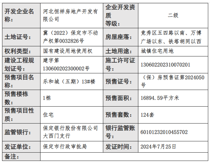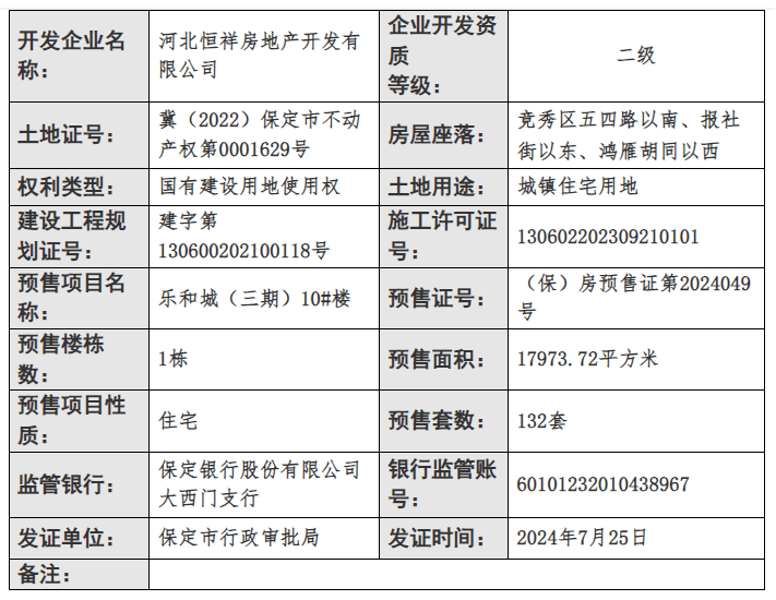 2024年7月26日,保定市行政审批局公布了两则商品房预售许可证下发信息,乐和城(三期)10#楼、乐和城(五期)13#楼获发预售。
