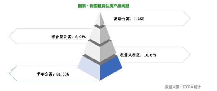 报告显示,我国租赁住房类型整体呈现出明显的“正金字塔”形态:满足年轻人需求的青年公寓占比较大,超过80%;其次是满足新市民需求的租赁式社区,占比超过10%;面对企业基层员工的宿舍型公寓占比8.62%;高端公寓比例仅为1.35%。