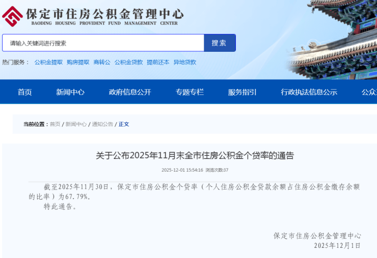 2025年11月末保定住房公积金个贷率67.79%