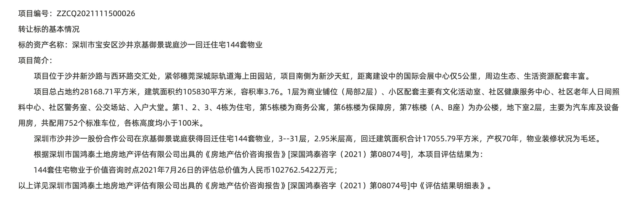 沙一股份在京基御景珑庭获得回迁住宅144套物业,3-31层,2.95米层高,回迁建筑面积合计17055.79平方米,产权70年,物业装修状况为毛坯。