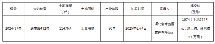 2025年6月5日,河北创秀园区管理有限公司成功竞得主城区2024-38号工业用地的国有建设用地使用权。