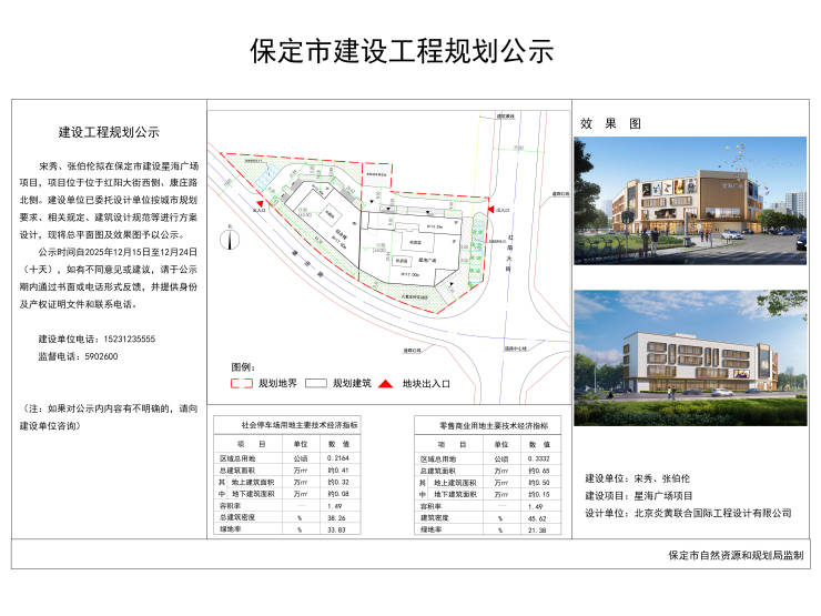 宋秀、张伯伦拟在保定市建设星海广场项目,公示时间至2025年12月24日,接受公众反馈。