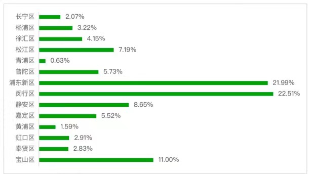再从分布来看,克而瑞数据显示,闵行区和浦东新区的供给量靠前,分别录得80个项目和98个项目,房间规模分别为19547间和19090间,占比合计超过42%。另外,宝山区供给量也较可观,共录得43个项目,房间规模为9552间,占比达11%。