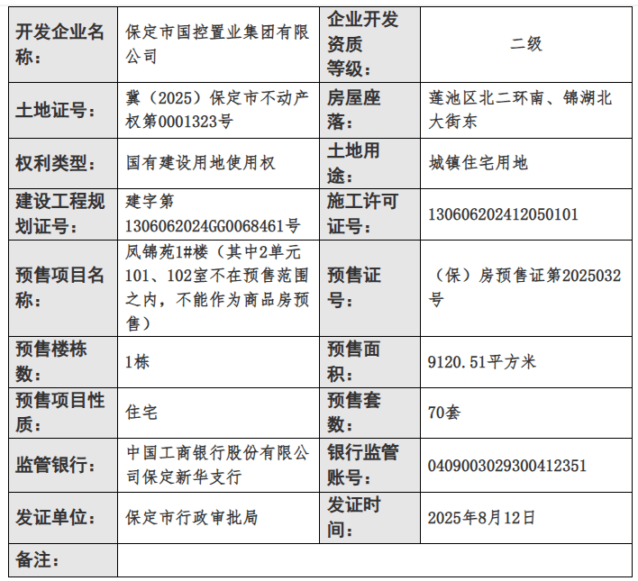 证件丨保定凤锦苑项目获发预售证 预售房源70套