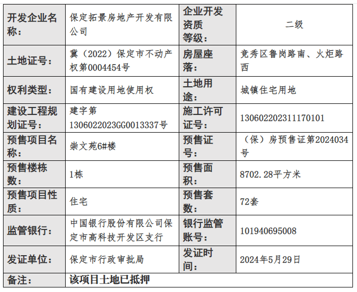 2024年5月30日,保定市行政审批局公布了一则商品房预售许可证下发公告,崇文苑6#楼商品房获预售许可,共1栋楼楼。商品房预售证号为(保)房预售证第2024034号,预售面积8702.28平方米,预售套数72套。