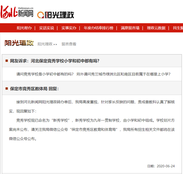进展丨保定竞秀学校已命名“新秀学校” 学校划片方案尚未公布