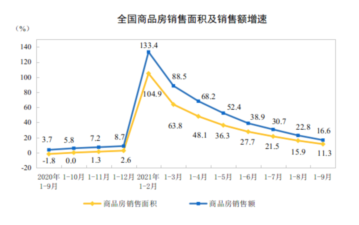 10月18日,国家统计局新闻发言人、国民经济综合统计司司长付凌晖在介绍2021年前三季度国民经济运行情况时表示,今年以来,通过完善房地产市场的长效机制,抑制不合理需求,推动刚性需求平稳释放,限制部分房地产企业依靠举债盲目扩张,房地产市场总体上趋于平稳,房地产投资、销售和房价逐步趋于稳定。前三季度,全国商品房销售面积同比增长11.3%,两年平均增长4.6%,比1-8月份回落1.3个百分点。房地产开发投资同比增长8.8%,两年平均增长7.2%,比1-8月份回落0.5个百分点。7月、8月份,70个大中城市的房价涨幅也整体上趋于回落。下一阶段,随着多主体供应、多渠道保障,购租并举住房制度不断完善,市场主体趋于理性,房地产市场有望保持平稳发展。