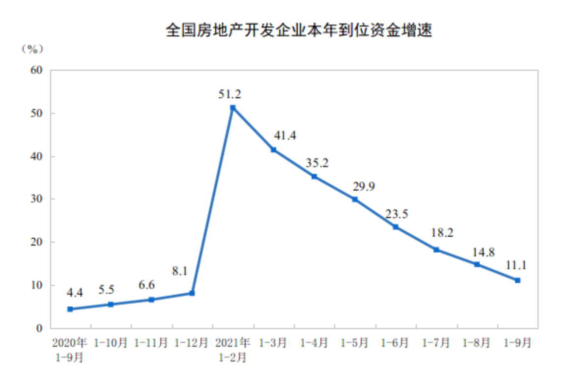 国家统计局数据显示,1-9月份,房地产开发企业到位资金151486亿元,同比增长11.1%;比2019年1-9月份增长16.0%,两年平均增长7.7%。其中,国内贷款18770亿元,下降8.4%;利用外资59亿元,下降36.9%;自筹资金47212亿元,增长6.1%;定金及预收款56689亿元,增长25.6%;个人按揭贷款24124亿元,增长10.7%。