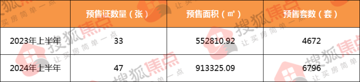 相较2023上半年,2024年上半年新发预售证数量年同比增加42.42%,新增预售套数年同比增加45.46%,新增预售面积年同比增加65.21%。