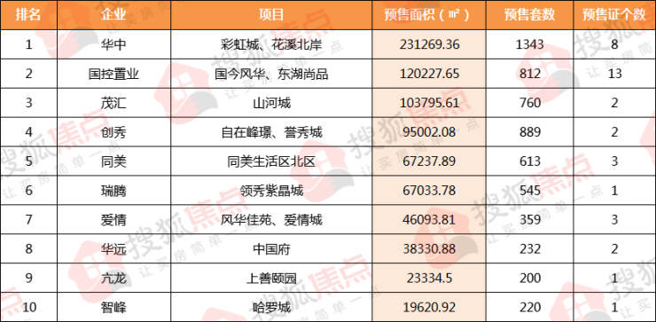 从房企来看,2024年上半年有18家房企楼盘获得商品房预售许可证。其中,华中集团新增预售面积与套数均位列第一,预售房源面积总计231269.36平方米,预售套数总计1343套,获证楼盘为彩虹城、花溪北岸。其次,国控置业新增预售面积位列第二,预售房源面积总计120227.65平方米,预售套数812套,获证楼盘为国今风华、东湖尚品。茂汇地产新增售面积位列第三,预售房源面积总计103795.61平方米,预售套数760套,获证楼盘为山河城。