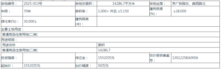 2025年3月5日,保定市公共资源交易中心发布国有建设用地使用权拍卖出让公告,主城区2025-013号地块拍卖出让。该地块位于京广铁路东、薛西路北,地块面积14286.7平方米,约合21.43亩,土地用途为居住用地,容积率1.000< 并且 ≤5.150。