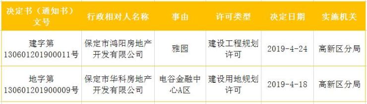 2019年5月17日,保定市城乡规划局公布了“2019年4月建设工程规划许可审批信息(高新区)”,信息显示,雅园获批建设工程规划许可,电谷金融中心A区获批建设用地规划许可。【获证详情 见下图】