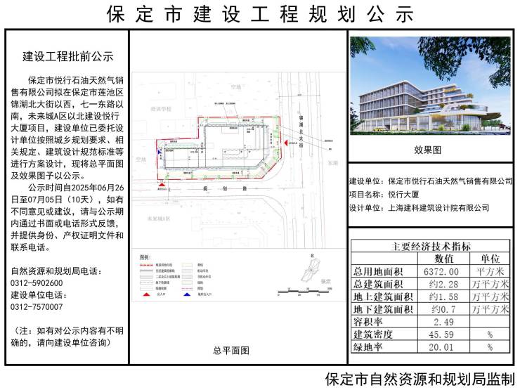 保定悦行石油天然气销售有限公司将在莲池区建设悦行大厦,总平面图及效果图已公示,公示时间为10天。如有意见或建议,可通过电话或书面方式反馈。自然资源和规划局电话:0312-5902600,建设单位电话:0312-7570007。