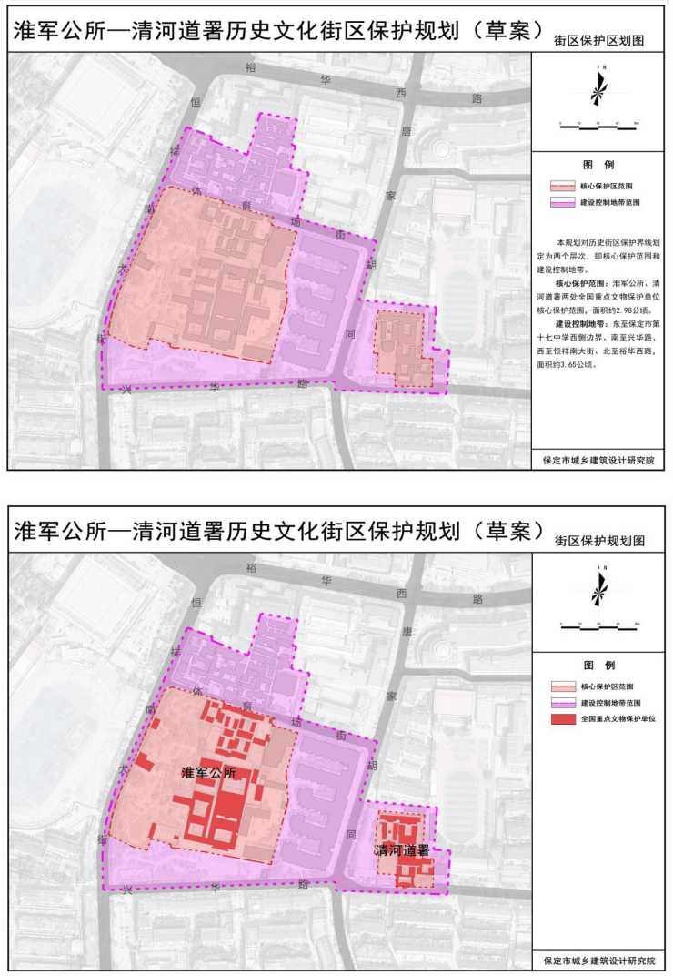淮军公所—清河道署历史文化街区范围东至保定市第十七中学西侧边界,南至兴华路,西至恒祥南大街,北至裕华西路,总面积约 6.63 公顷。规划的规划期限为 2021—2035 年。其中近期为2021—2027 年,远期为 2028—2035 年。规划街区以文化展示、观光旅游、品质生活为功能,以建筑风貌、历史文化为特色,通过古戏楼、水利治理的文化展示,打造保定市古城内“徽风北韵、京畿水枢、古今交融、智慧宜居”的特色街区。