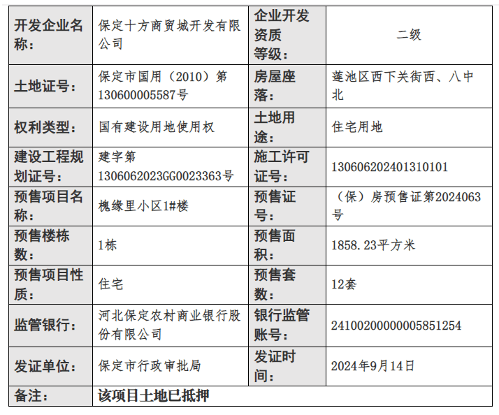 2024年9月14日,保定市行政审批局公布了一则商品房预售许可证下发信息,槐缘里项目1#楼获发预售证,预售面积1858.23平方米,预售12套,预售证号(保)房预售证第2024063号。