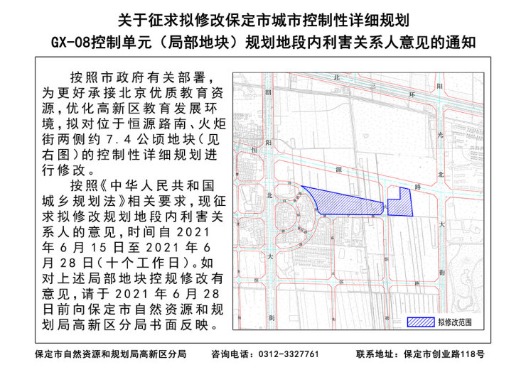 2021年6月15日,保定市自然资源和规划局公布了“关于征求拟修改保定市城市控制性详细规划GX-08控制单元(局部地块)规划地段内利害关系人意见的通知”。