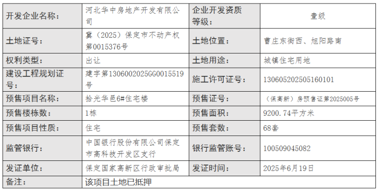 其中拾光华邑6#住宅楼预售面积9200.74平方米,预售套数68套,预售证号:(保高新)房预售证第2025005号。