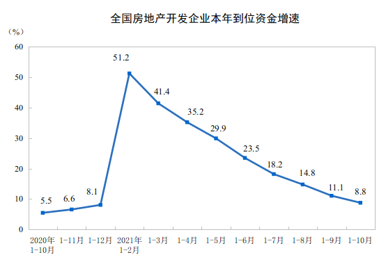统计局数据显示,1-10月房企到位资金为166597亿元,同比增长8.8%;比2019年1—10月份增长14.8%,两年平均增长7.1%。分项来看,国内贷款、利用外资、自筹资金、定金及预收款以及个人按揭贷款分别为20148亿元、72亿元、52617亿元、62040亿元、26678亿元,同比增速分别为-10.0%、-35.1%、5.1%、21.0%以及9.7%。其中销售回款占比为53%,与上月持平,保持稳定。