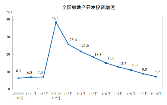 11月15日,国家统计局公布房地产开发投资数据显示,1—10月,全国房地产开发投资124934亿元,同比增长7.2%;比2019年1—10月份增长14.0%,两年平均增长6.8%。其中,住宅投资94327亿元,增长9.3%。