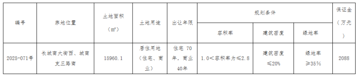 此次推出的地块为2025-071号,位于长城南大街西、城南支三路南,土地面积15960.1平米,约23.94亩,土地用途为居住用地(住宅、商业),1.0<容积率为≤2.8。