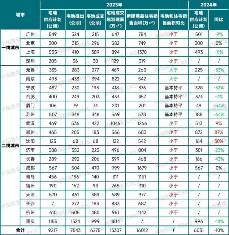 注:重庆为全市口径;上海供地计划按均值计算。北京供地计划按下限计算。长春同比对标的2023供地计划为中期调整版;郑州为住宅用地口径;杭州、天津、南京、福州、深圳、青岛、长沙尚未发布2024年供地计划。