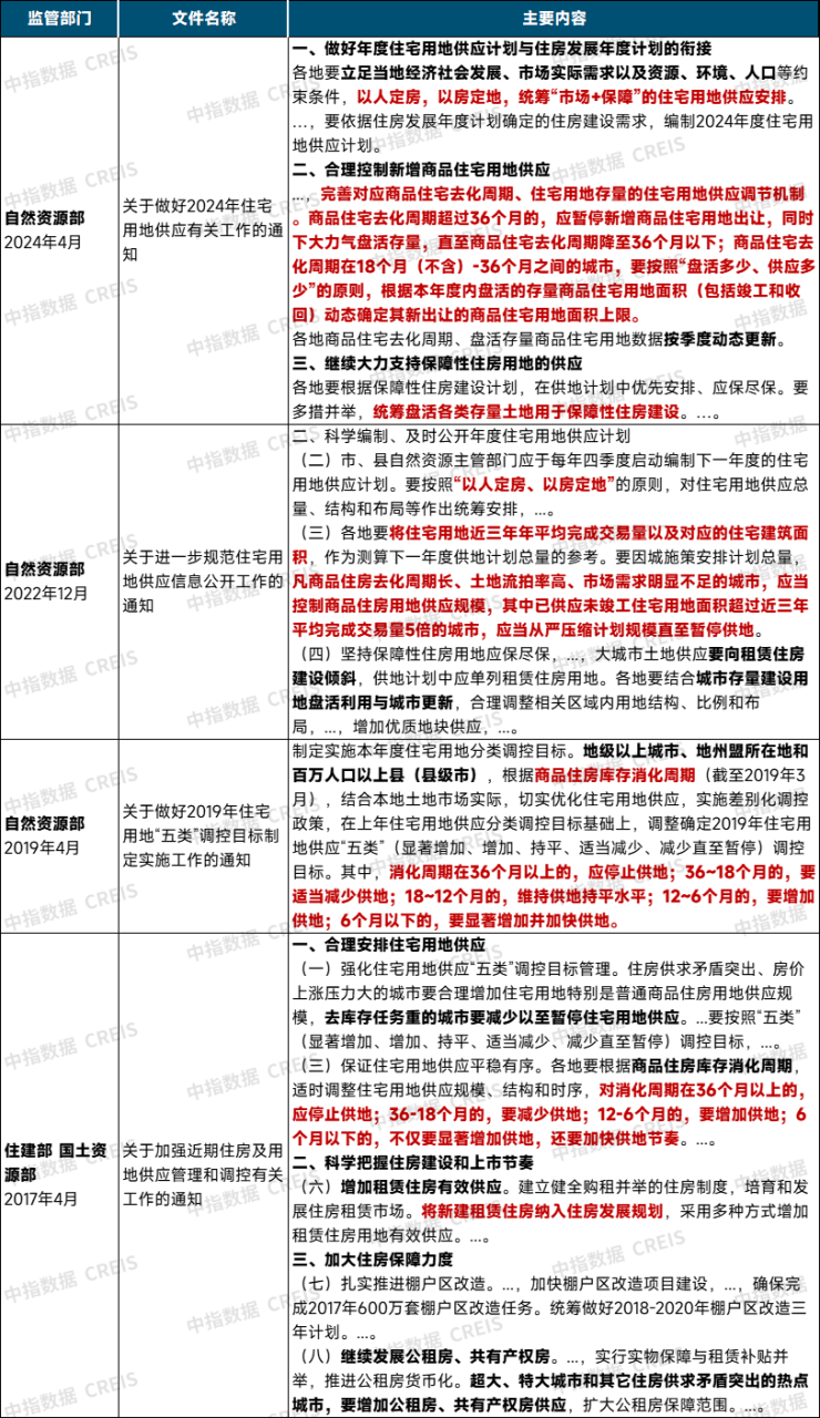 早在2017年,国土资源部与住建部就已联合发文,要求强化“五类”调控目标,合理安排住宅用地供应。并在2019年也发布通知,要求消化周期在36个月以上的,应停止供地;36~18个月的,要适当减少供地;18~12个月的,维持供地持平水平;12~6个月的,要增加供地;6个月以下的,要显著增加并加快供地。