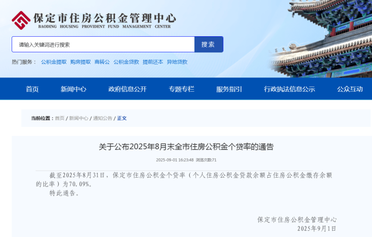截至2025年8月31日,保定市住房公积金个贷率(个人住房公积金贷款余额占住房公积金缴存余额的比率)为70.09%。