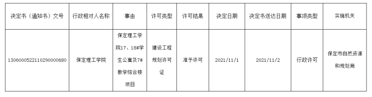 2021年11月3日,搜狐焦点由保定市自然资源和规划局获悉,保定理工学院17、18#学生公寓及7#教学综合楼项目获发建设工程规划许可证。