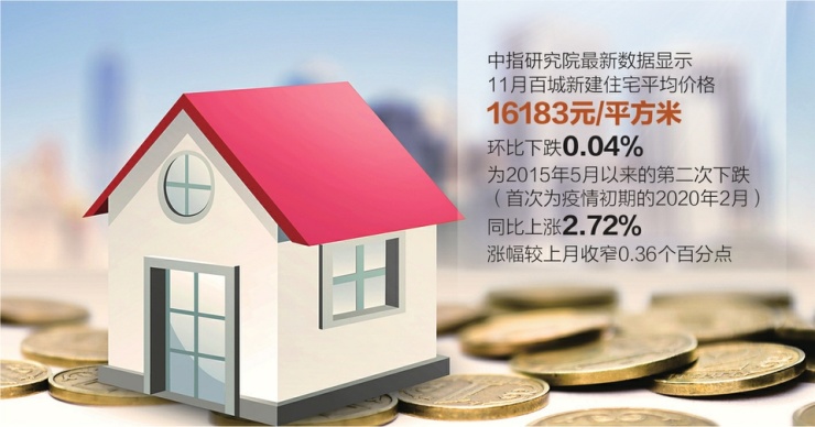 中指研究院较新数据显示,11月百城新建住宅平均价格为16183元/平方米,环比下跌0.04%,为2015年5月以来的第二次下跌(首次为疫情初期的2020年2月);同比上涨2.72%,涨幅较上月收窄0.36个百分点;百城二手住宅平均价格为16013元/平方米,环比下跌0.08%,跌幅较上月扩大0.04个百分点;同比上涨3.66%,涨幅较上月收窄0.38个百分点。