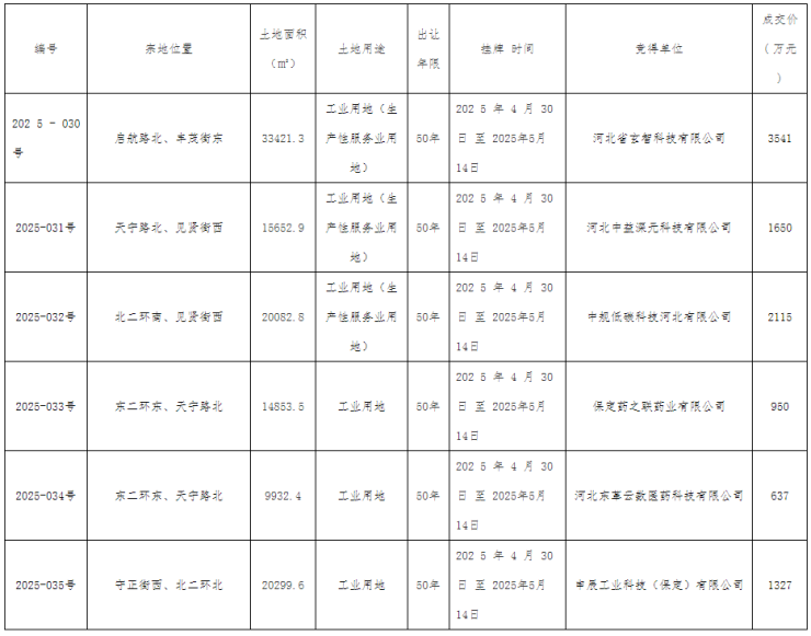 2025年5月15日,保定市公共资源交易中心国有建设用地使用权拍卖出让结果公示,主城区6宗工业用地成功出让,成交总价10220万元。