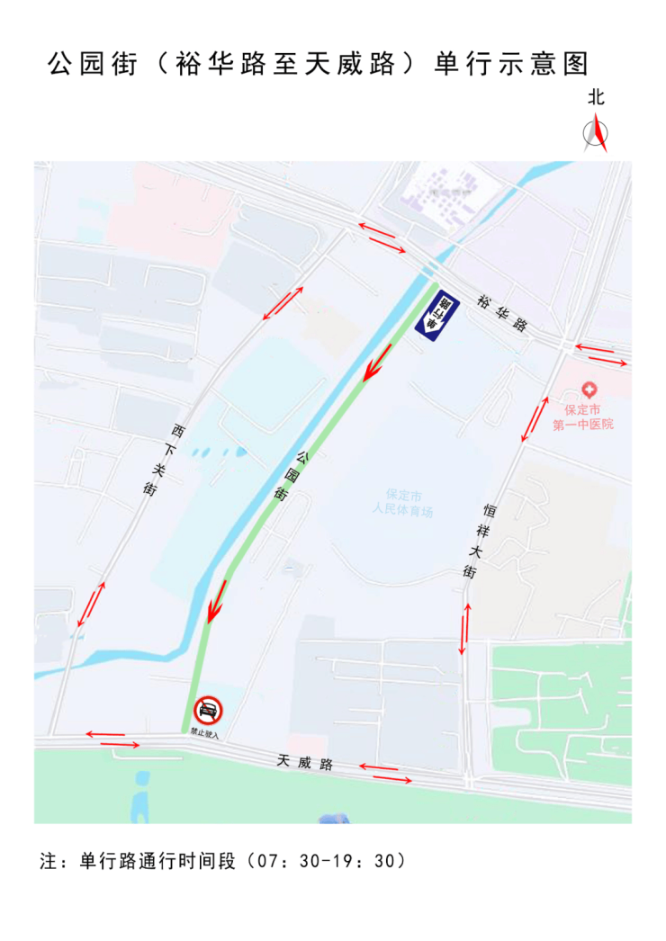 保定市公安局恢复公园街机动车限时单向通行,时间7:30-19:30,由北向南行驶,自2025年11月3日起实施。