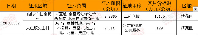 搜狐焦点“楼市快讯”,2018年3月2日,保定市国土资源局发布了两宗清苑区的征地公告,涉及清苑区白团乡白团南街村及大庄镇史庄村两个行政村,征地面积共12.1012公顷,约合181.518亩,征地用途涉及工矿仓储用地和公共管理与公共服务用地。