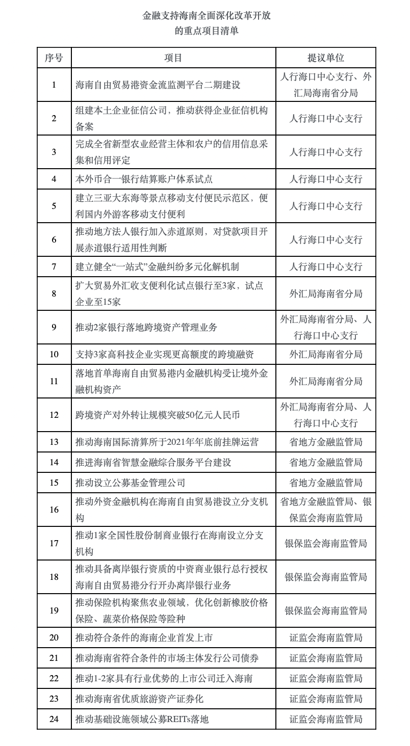 此次《实施方案》的落实措施共有89条,并明确了24个金融支持海南全面深化改革开放的重点项目清单。