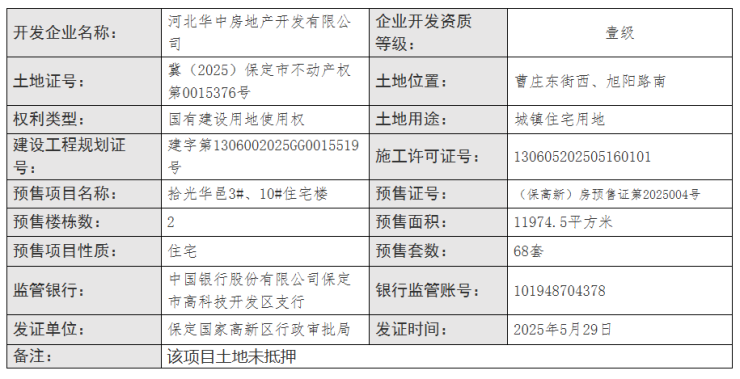 2025年5月29日,保定国家高新区行政审批局公布了一则商品房预售许可证下发信息,华中·拾光华邑项目3#、10#楼获发预售证,预售面积11974.5平方米,预售套数68套,预售证号(保高新)房预售证第2025004号。
