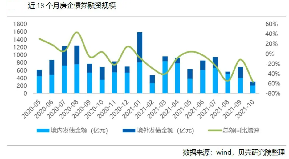 贝壳研究院统计显示,今年1-10月房企境内外债券融资累计约7993亿元,较2020年同期下降24%,金额规模减少2463亿元;其中境外发债折合人民币约2471亿元,同比下降约37.4%。境外融资规模占比维持31%左右的低水平。
