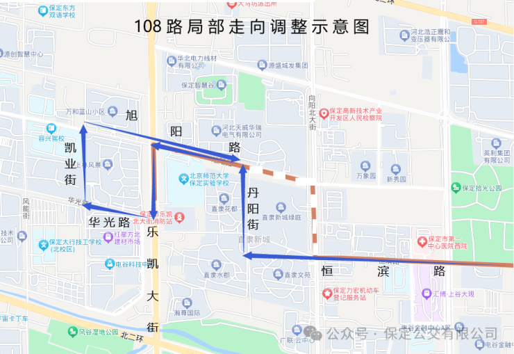 108路末端向阳大街至旭阳路走向调整为恒滨路、丹阳街、旭阳路、乐凯大街、华光路、凯业街、旭阳路。调整后增加恒滨路向阳大街西口站、丹阳街恒滨路口站、旭阳路丹阳街口站、新秀学校站。不再停靠向阳大街恒滨路口站、旭阳路向阳大街口站。