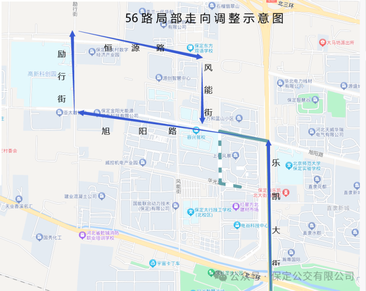56路末端华光路至凯业街走向调整为旭阳路、励行街、恒源路、风能街。调整走向后增加高新区专家公寓站、旭阳路风能街口站、旭阳路励行街口站、高新科创园站、保定中关村产业园站、电谷源创智慧中心北门站、电谷源创智慧中心站、风能街凯泽路口站。不再停靠上林风景西门站、上林风景南门站。