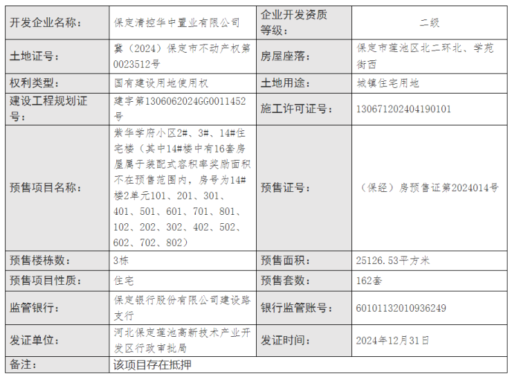 2024年12月31日,保定国家高新区行政审批局公布了一则商品房预售许可证下发信息,紫华学府小区2#、3#、14#住宅楼项目获发预售证,预售面积25126.53平方米,预售套数162套。