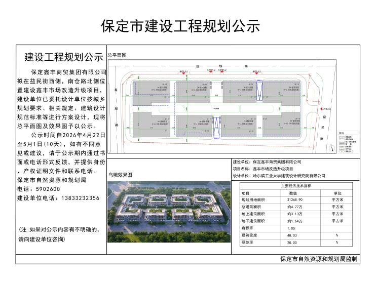 保定鑫丰商贸集团拟在益民街西侧建设改造市场,公示时间4月22日至5月1日,接受反馈。