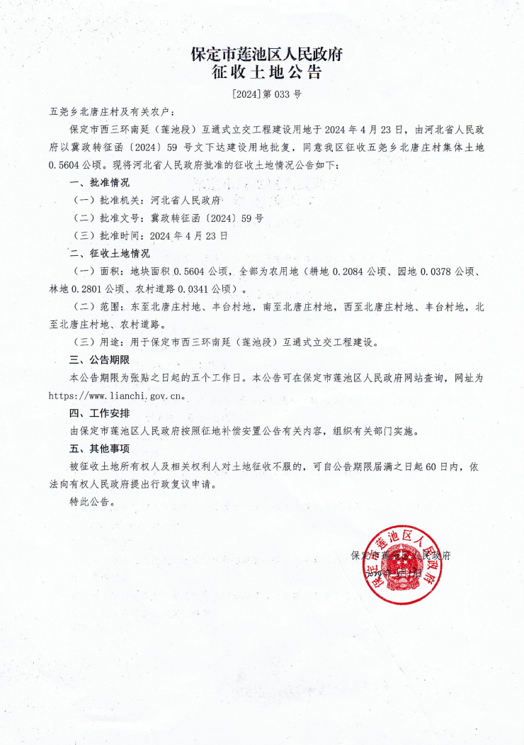 2024年5月17日,保定市莲池区人民政府公布了2则征收土地公告,征地用途为西三环南延(莲池区段)建设用地,征地总面积10.4523公顷,涉及五尧乡北唐庄村。