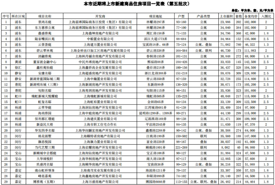 10月16日,上海市房地产交易中心 “网上房地产”网站公示了《本市近期将上市新建商品住房项目一览表(第五批次)》,共推出57个新盘,总计15206套房源,并将于近期陆续上市。