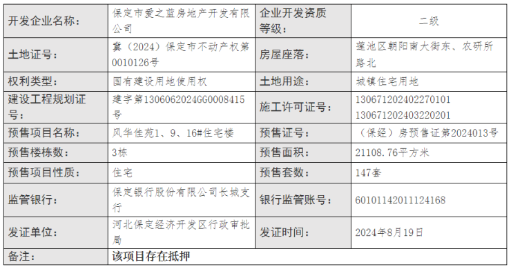 风华佳苑项目1、9、16#住宅楼获发预售证,预售面积21108.76平方米,预售套数147套,预售证号 ;(保经)房预售证第2024013号。
