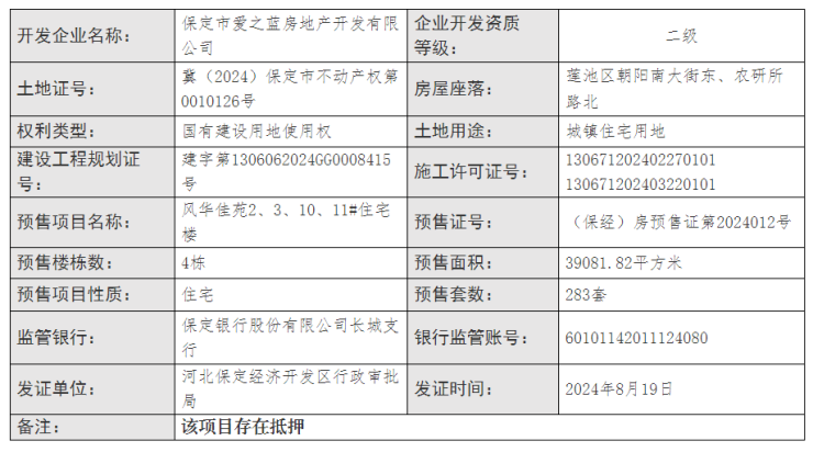 2024年8月19日,河北保定经济开发区行政审批局公布最新商品房预售许可证办理信息公示,风华佳苑项目2、3、10、11#住宅楼获发预售证,预售面积39081.82平方米,预售套数283套,预售证号 ;(保经)房预售证第2024012号。