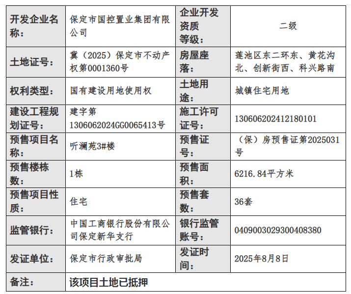 2025年8月8日,保定市行政审批局公布了最新商品房预售许可证下发信息,听澜苑3#楼商品房获发预售证,预售面积6216.84平方米,预售套数36套,预售证号(保)房预售证第2025031号。