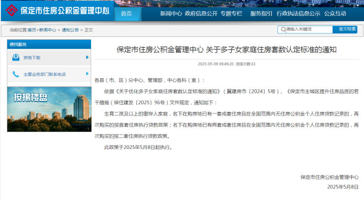 为支持多子女家庭住房需求,保定市住房公积金管理中心于5月8日发布《关于多子女家庭住房套数认定标准的通知》。