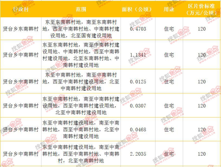 公告显示,东南韩村、中南韩村共征地3.8979公顷,约合58.47亩,征地用途均为住宅。其中,贤台乡中南韩村征地3.4276公顷,约合51.41亩;东南韩村征地0.4703公顷,约合7.05亩。【征地详情 见下图】