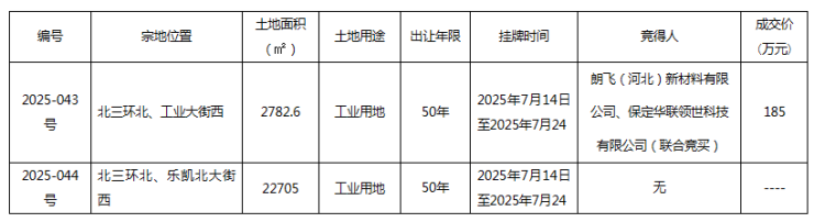 2025年7月25日,保定市2025-043号工业用地成功出让,由朗飞(河北)新材料有限公司与保定华联领世科技有限公司联合竞得,成交价185万元,2025-044号流拍。