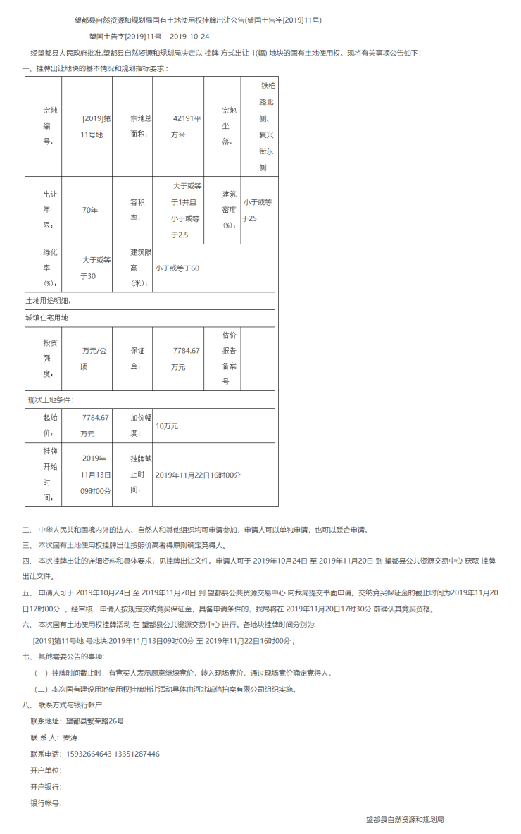 2019年10月25日,河北省公共资源交易中心公布了望都县自然资源和规划局国有土地使用权挂牌出让公告,公告显示,望都县挂牌出让编号为[2019]第11号地块,出让面积为42191平方米,约63.3亩。地块位于铁柏路北侧、复兴街东侧,土地用途为城镇住宅用地