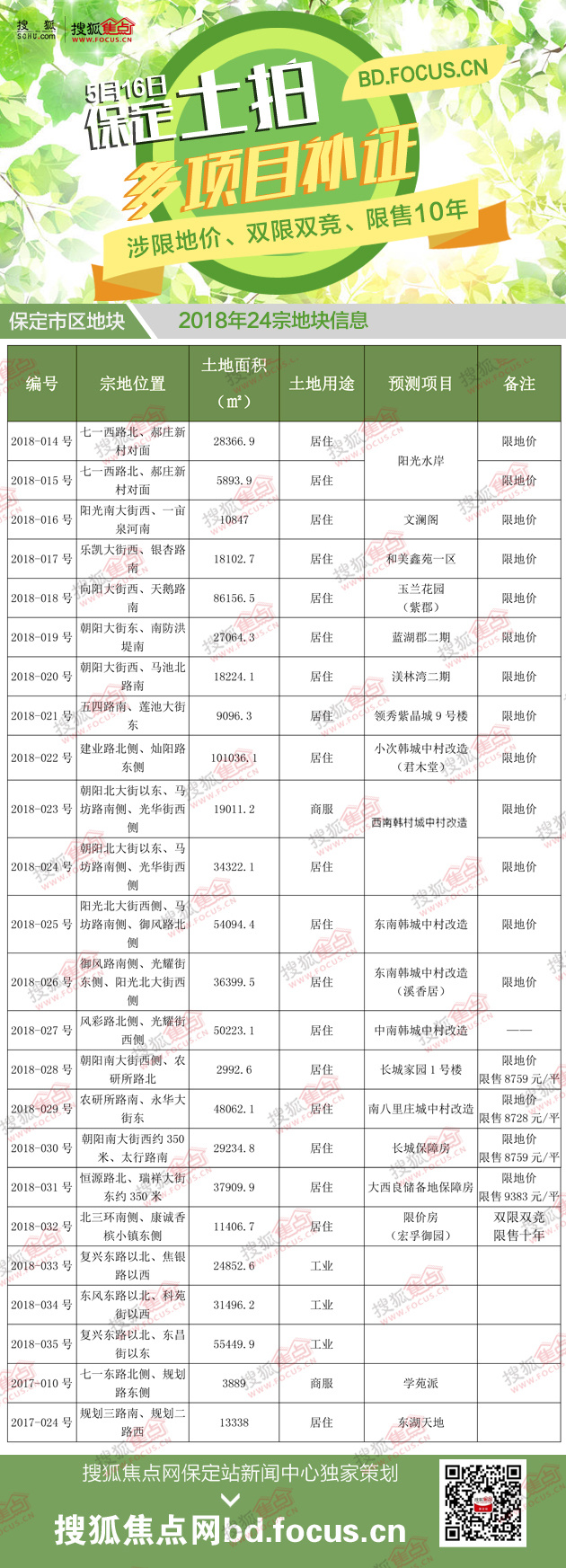 2018年5月16日,保定主城区24宗地块挂牌出让,含19宗住宅用地、2宗商服用地、3宗工业研用地,总面积达757469.9平方米,约合1136.2亩。其中包含2宗2017年流拍地块。