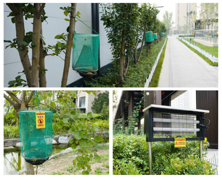 在园区内植被茂密处设置灭蚊灯和捕蝇笼,让业主们不论何时何地都能免受蚊虫烦扰。